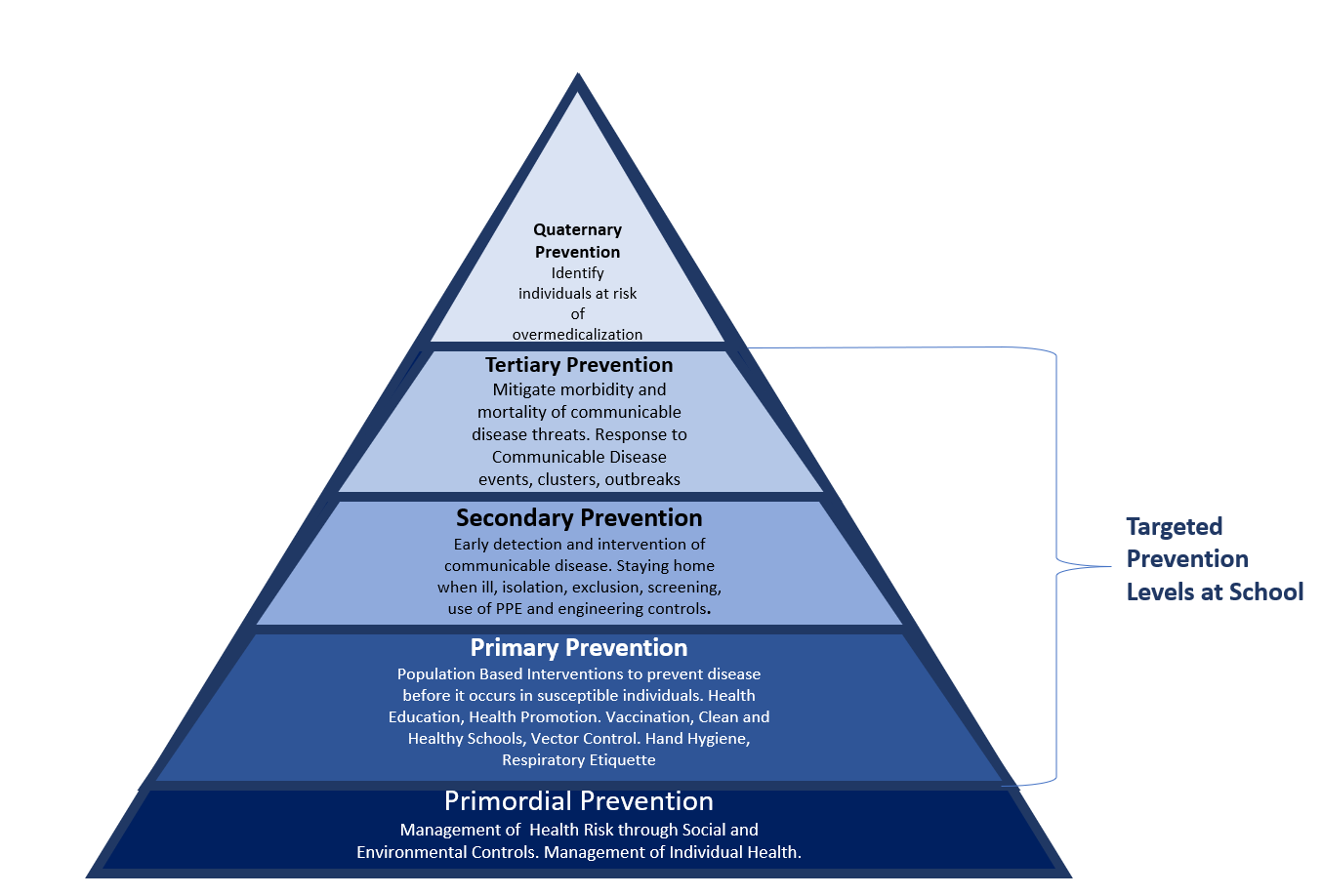 Levels of Prevention are regarded as essential public health operations to protect and improve overall health of populations and communities (WHO, 2022). Endorsing a leveled approach to communicable disease management creates a framework of embedding prevention at every level of management and response [ i.e. preventing disease, preventing spread, preventing complications, preventing sequelae].